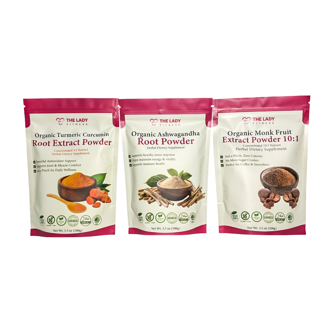 Boost your immunity, energy, and inner balance with this trio of organic superfoods: Turmeric Curcumin, Ashwagandha Root Powder, and Monk Fruit Extract. All-natural, powerful, and perfect for daily wellness.